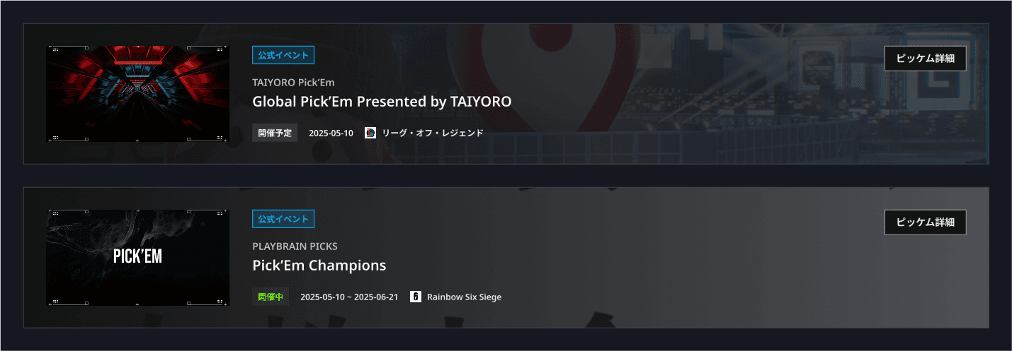 「どちらのチームが勝つ?」「最初にキルするのは誰?」など、試合中のさまざまな展開を予想して楽しむ投票型ゲームです。 TAIYOROのピッケムでは、さまざまなゲームタイトルのピッケムに無料で参加できます。